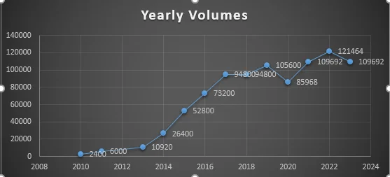 RKB MANAGEMENT CONSULTANTS experiences a constant 8% increase in volume occupancy from every client each year, we can represent this growth trend graphically using a below diagram